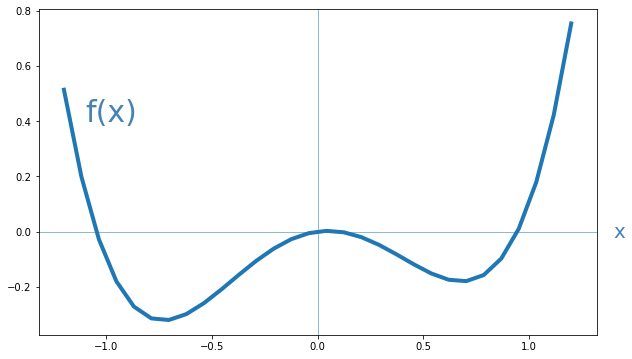 Supongamos que esta función muestra el error cometido por una red neuronal con un único parámetro x (un peso o un bias). Se trata de un ejemplo absurdamente simple, pero nos sirve para entender el enfoque. Lo que querríamos sería encontrar el valor del parámetro x para el que la función (el error) toma un valor mínimo.