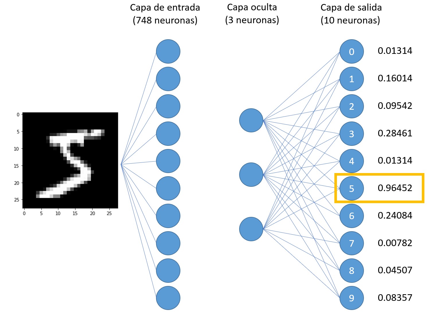 En este ejemplo se supone que estamos pasando a la red los 28x28 valores que forman la imagen (solo se muestran 10 de las 748 neuronas), que tenemos una única capa oculta con tres neuronas (no se muestran los enlaces que las unen a las neuronas de la capa de entrada) y 10 neuronas en la capa de salida. Si la imagen de entrada representa un "5" y la red está correctamente configurada, el valor más elevado de los obtenidos en la capa de salida será el correspondiente a la neurona que ocupa el índice o posición 6 (si comenzamos a contar neuronas a partir del número 0). Vemos, por ejemplo, que la red ha asignado el valor 0.01314 a la posibilidad de que la imagen de entrada represente un cero y comprobamos que, efectivamente, el valor más elevado es el correspondiente al número 5 (la sexta neurona): 0.9645.