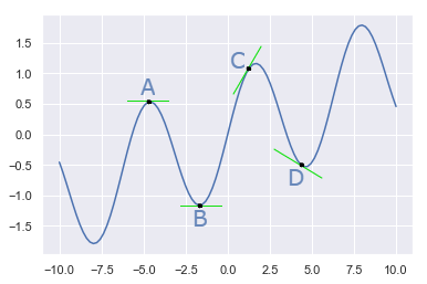 En la función mostrada en la imagen anterior se han escogido 4 puntos: A, B, C y D y se han dibujado (en verde) las rectas tangentes a la función en dichos puntos: En A y en B la tangente es una línea horizontal, lo que significa que la función, en dichos puntos, es horizontal y su derivada en ellos es cero. La tangente en el punto C es una línea creciente, lo que significa que la derivada de la función en C es un número positivo (por ejemplo... 3). En D la tangente es decreciente, lo que implica que la derivada es negativa, tal vez... -2.