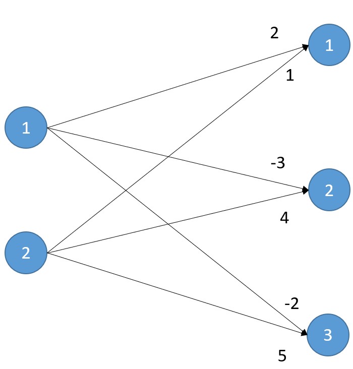 En este gráfica se han numerado las neuronas de las dos capas a partir del número 1 y de arriba hacia abajo, y se han ocultado los bias y posibles capas previas o posteriores.