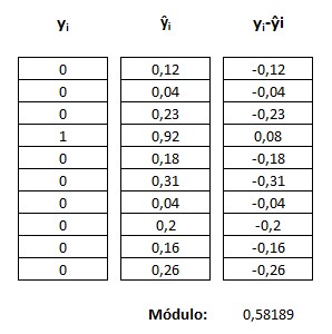 En la imagen anterior partimos de la variable objetivo correspondiente al número 3 (yi), nos inventamos una supuesta predicción (ŷi) y obtenemos la diferencia de ambos vectores (yi-ŷi). En la parte inferior se muestra el módulo de este último vector: 0.58189, obtenido como la raíz cuadrada de la suma de los cuadrados de los componentes del vector.