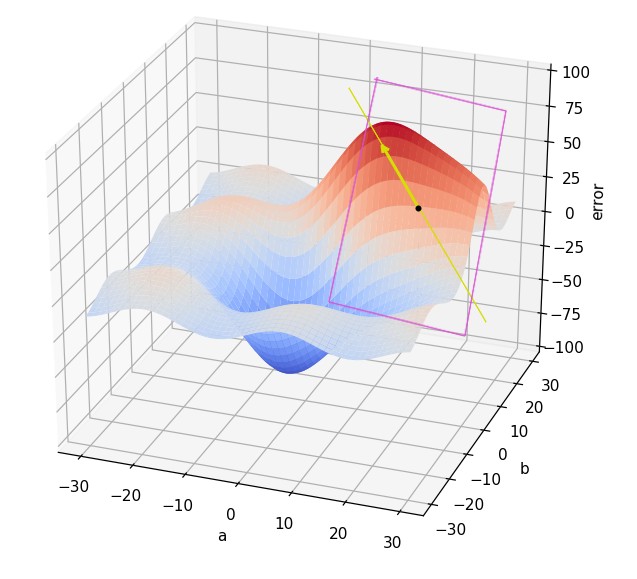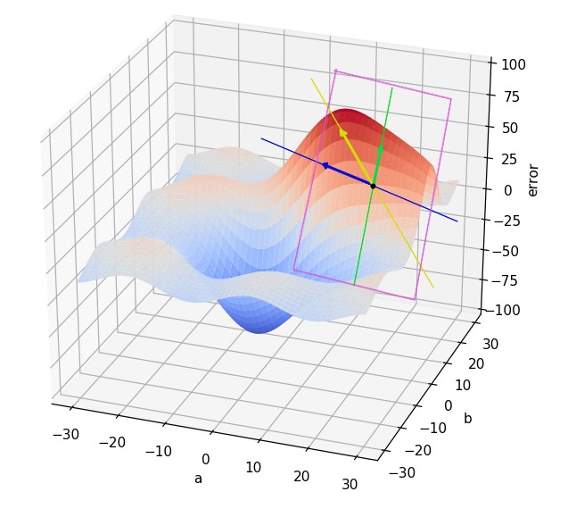 En esta imagen se muestra en verde la derivada parcial de la función con respecto a la variable b, y en azul la derivada parcial de la función con respecto a la variable a. Como puede verse, estos dos vectores (paralelos a los ejes) definen el vector gradiente.