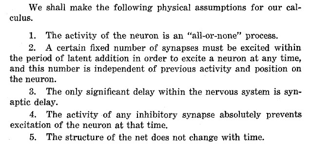 Drupal\editor\Plugin\Filter\EditorFileReference->process('En el artículo "<em>A Logical Calculus of Ideas Immanent in Nervous Activity</em>" -que puedes descargar <a href="http://www.interactivechaos.com/sites/default/files/docs/mcculloch_pitts_logical_calculus_1943.pdf" target="_blank">aquí</a>- McCulloch y Pitts presentan un modelo que aproxima el comportamiento de las neuronas biológicas. Los autores parten de cinco hipótesis al respecto de éstas cuya traducción es más o menos la siguiente: