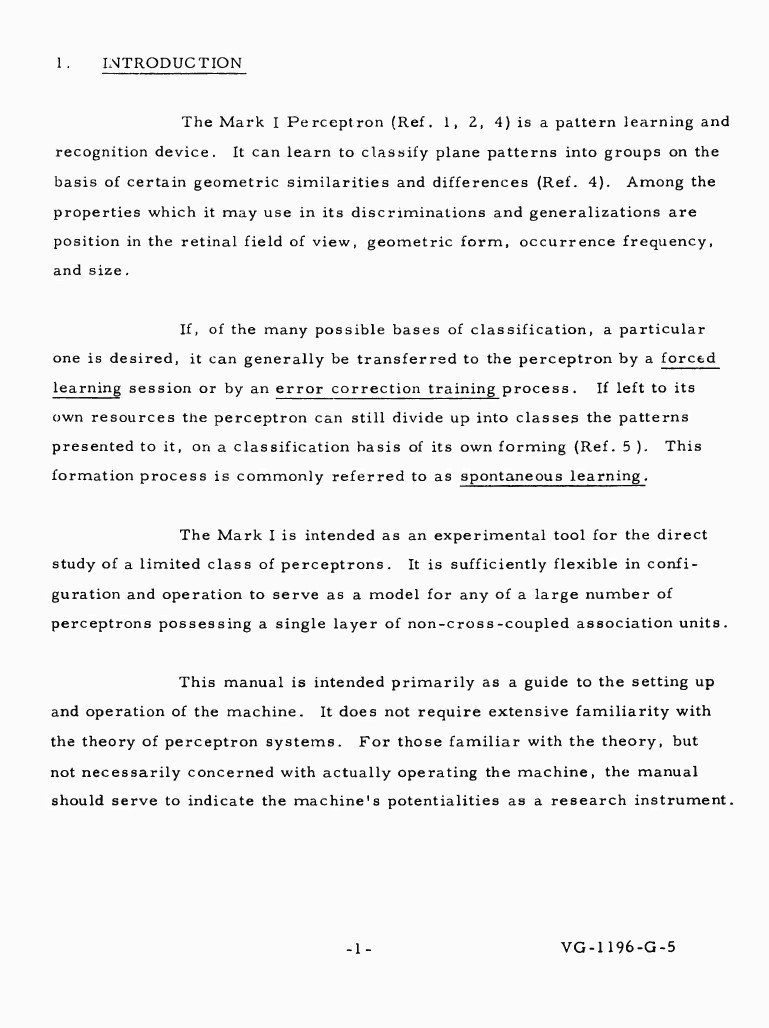 <em>El Mark I está concebido como una herramienta experimental para el estudio directo de una clase limitada de perceptrones. Tiene una configuración y método de operación suficientemente flexible como para servir de modelo para cualquiera de un gran número de perceptrones incluyendo una sola capa de unidades de asociación sin acoplamiento cruzado.</em>"