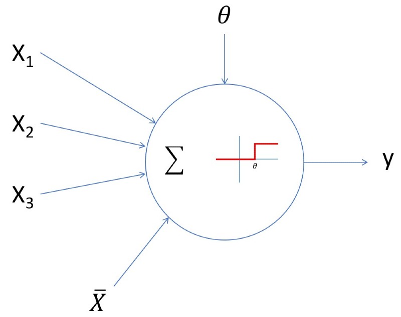 En la imagen anterior se ha separado una de las señales, X̄, representando la/s posible/s señal/es inhibidora/s activa/s que pueda/n existir (es irrelevante que haya una o varias pues la neurona se comportaría de igual forma en todos los casos, emitiendo una señal de valor 0). De esta forma, suponemos que el resto de señales Xi son excitadoras. Y en el "interior" de la neurona se muestran las dos funciones que se aplican a los datos: la suma de las señales de entrada (Σ) y, a continuación, la función de activación que transforma el valor anterior en 1 o en 0 en función de que se alcance o no el umbral de excitabilidad de la neurona (θ).