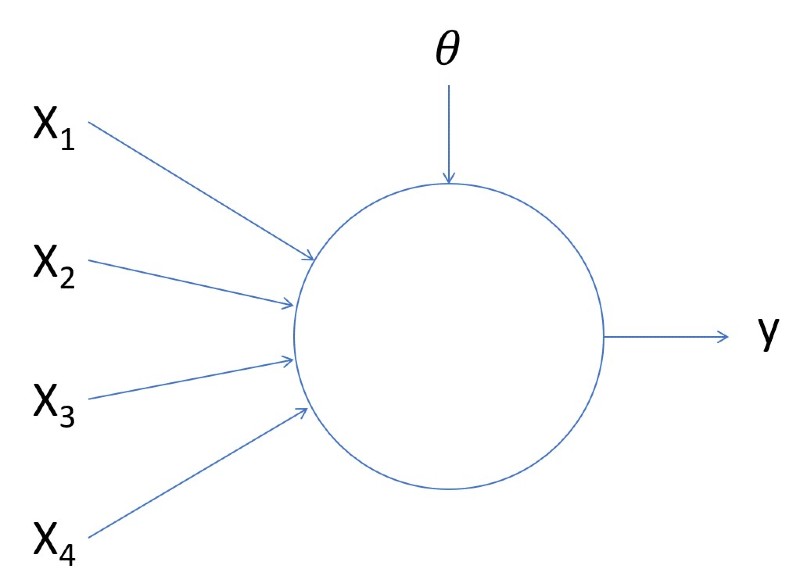 En él estamos representando una neurona con cuatro señales de entrada: X1, X2, X3 y X4. Estas señales pueden ser excitadoras o inhibidoras, y sus valores podrán ser 0 o 1 (si se trata de una neurona inhibidora y toma el valor 0, se ignora. Por el contrario, si toma el valor 1, la salida de la neurona será 0 siempre, como hemos visto). La neurona también tiene asociado un umbral de excitabilidad θ, y la señal de salida queda representada con la letra <strong>y</strong>. Como hemos visto, el funcionamiento es el siguiente: