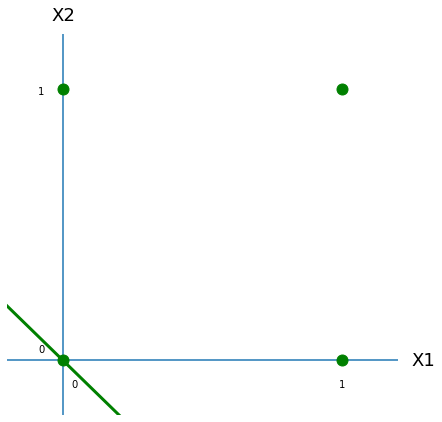 En este caso, las cuatro posibles combinaciones de X1 y X2 quedarían sobre la recta o por encima de ésta, lo que significa que -para este umbral- cualquiera de estas combinaciones provocaría la activación de la neurona (generando, por lo tanto, una señal de 1).