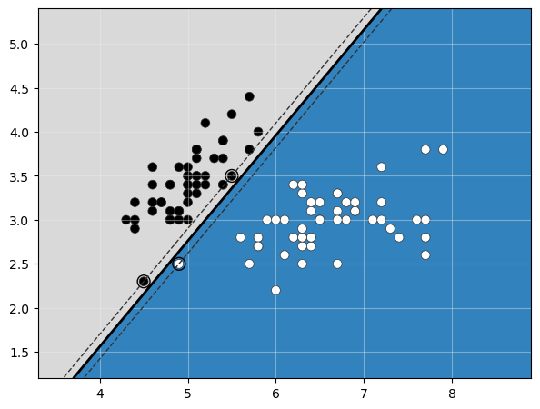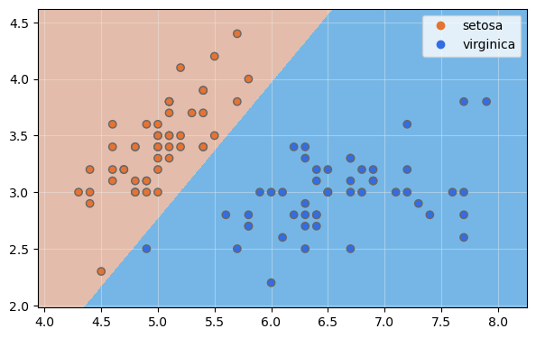 show_boundaries(model, X, None, y, None, iris.species.unique())