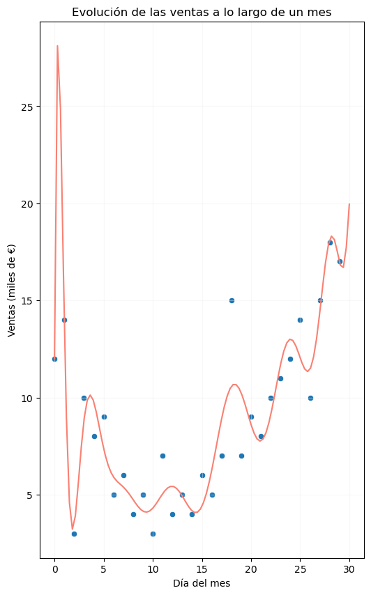 Y una cosa es cierta: este polinomio se ajusta mucho mejor a los datos de los que partimos para el análisis (de hecho, el polinomio pasa exactamente por encima de muchos de los puntos). Desde un punto de vista matemático no hay dudas de que este resultado es mucho mejor que los anteriores, pero ¿tiene sentido desde un punto de vista de negocio?, ¿de verdad vamos a pensar que entre el día 1 y el día 2 vamos a tener algún momento en el que se venderán productos por casi 30 mil euros? Evidentemente no: hemos ajustado tanto la curva a nuestros datos de entrenamiento que hemos perdido la capacidad de generalizar el resultado.