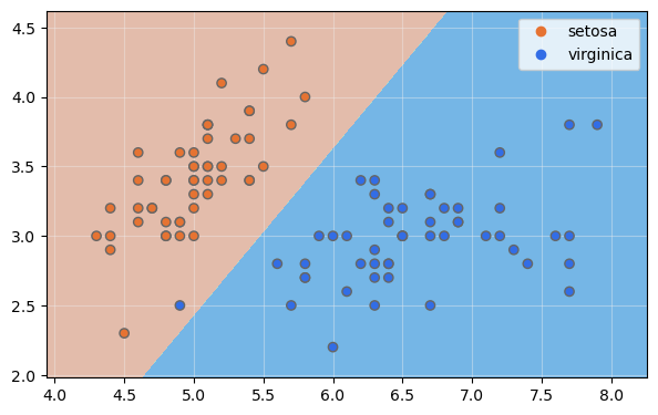 show_boundaries(model, X, None, y, None, iris.species.unique())