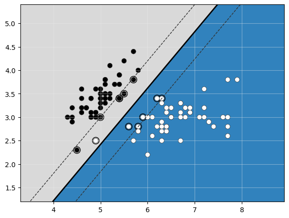 Si pudiésemos mostrar el margen y los vectores de soporte, veríamos que, para el parámetro de regularización escogido, son los siguientes: