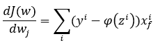 Si tenemos en cuenta que ϕ(z) no es más que la combinación lineal de los valores de entrada ponderados, resulta muy sencillo obtener la derivada parcial de la función con respecto a cualquiera de los parámetros wi. Concretamente: