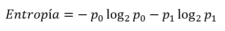 Y, al igual que se comentó para el índice Gini, la entropía toma el valor 0 cuando la proporción de la clase considerada sea igual a 0 o a 1, casos en los que solo habrá muestras de una única clase.