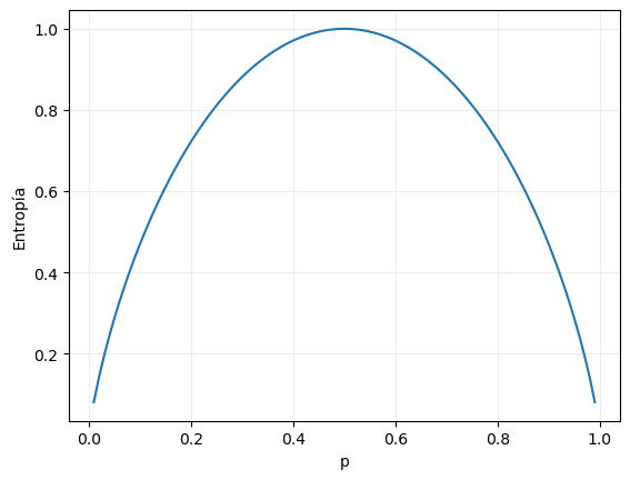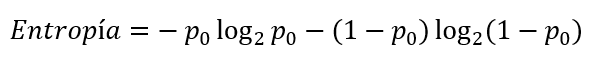 Por supuesto, el valor máximo de la entropía se da cuando la proporción de ambas clases es la misma (0.5), caso en el que la entropía toma el valor 1.