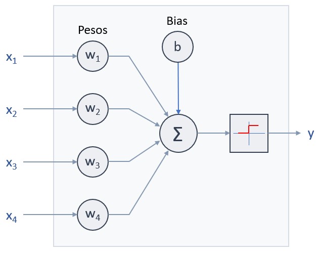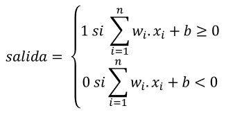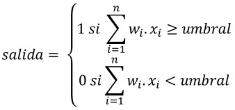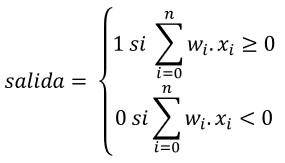 Es decir, cuando la suma de los productos de cada valor de entrada xi y el peso asociado wi sea mayor o igual que el umbral, la neurona devuelve un 1. En caso contrario devuelve un 0. Obsérvese que los sumatorios incluyen desde la señal de entrada 1 hasta la señal de entrada n.