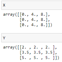 estamos suponiendo que la malla de puntos es de 3 x 3, y estamos generando un array bidimensional X con las coordenadas x de dichos puntos (tres coordenadas entre los valores 0 y 8), y un array bidimensional Y con las coordenadas y (tres coordenadas entre los valores 2 y 5):