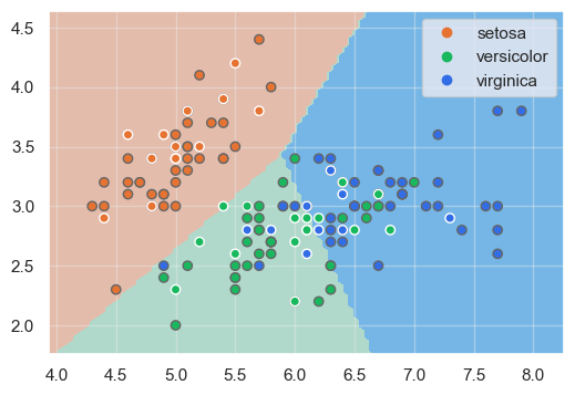 show_boundaries(model, X_train.values, X_test.values, y_train, y_test, iris.species.unique())