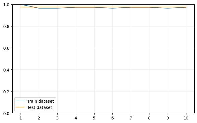 ax.plot(range(1, 11), test_scores, label = "Test dataset")