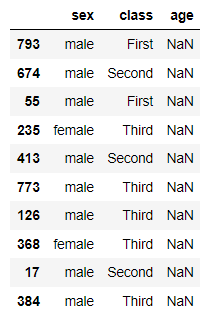 sample = titanic[titanic.age.isna()].sample(10, random_state = 4)[["sex", "class", "age"]]