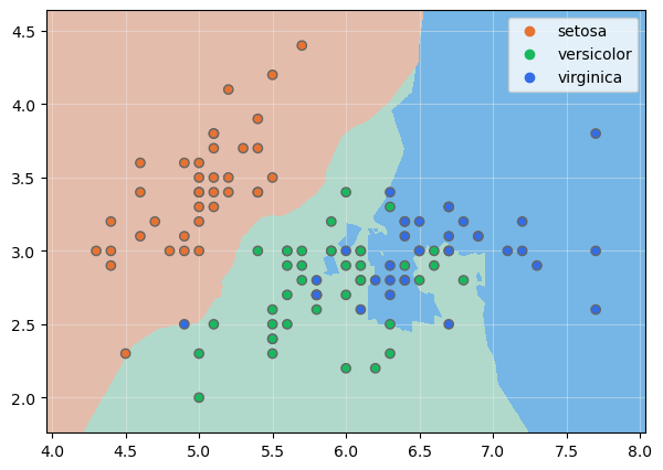 show_boundaries(model, X_train.values, None, y_train, None, iris.species.unique())