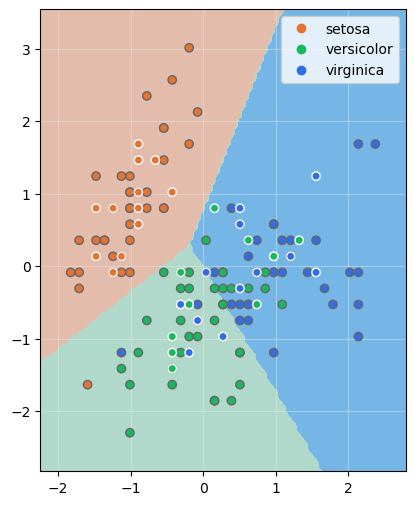 show_boundaries(model, X_train_std, X_test_std, y_train, y_test, iris.species.unique())