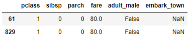 Vemos que la característica "<em>embark_town</em>" incluye dos valores nulos que podríamos plantearnos predecir a partir de, por ejemplo, las características "<em>pclass</em>", "<em>sibsp</em>", "<em>parch</em>", "<em>fare</em>" y "<em>adult_male</em>", que no incluyen valores nulos.