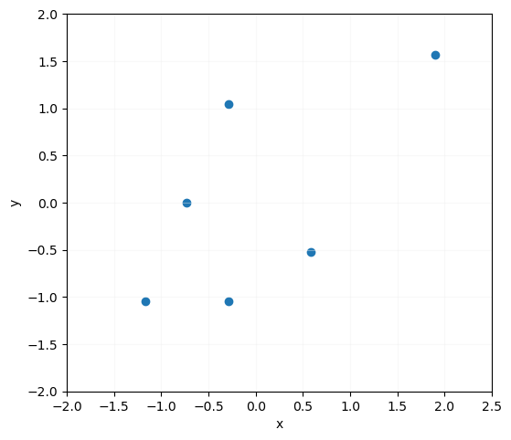Ahora los valores medios son nulos (la cifra que vemos de 1.11e-16 es debido al redondeo) y las varianzas iguales a 1. Si mostramos los puntos en una gráfica obtenemos el siguiente resultado:
