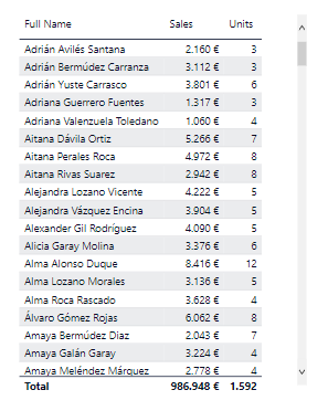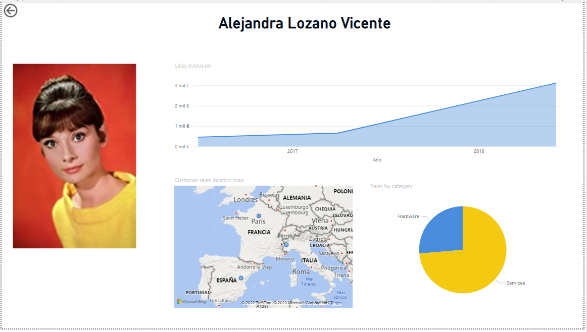 se cargará la página de destino siendo el modelo de datos filtrado según este cliente. Es decir, la tabla <em>Customers</em> se filtrará de forma que solo Alejandra Lozano Vicente esté seleccionada, y este filtro se propagará a la tabla de ventas, de forma que todos los objetos visuales que vemos en la página están mostrando información apenas de este usuario.