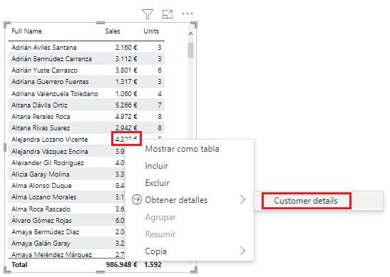 veremos una opción que antes no se mostraba: <strong>Obtener detalles</strong>. Al mover el cursor por encima de esta opción se muestra el listado de páginas de destino a las que podemos acceder desde este objeto visual (solo <em>Customer details</em> en nuestro ejemplo). Y si hacemos clic en este nombre de página: