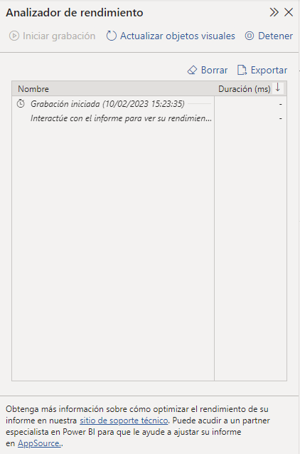 Si, por ejemplo, nuestro informe tarda mucho en actualizarse tras una interacción del usuario, este panel puede ayudarnos a buscar la fuente del problema.