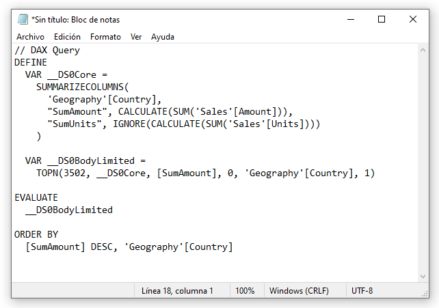 Podemos ver la consulta que define la actualización del objeto visual si hacemos clic en el enlace <em>Copiar consulta</em> que vemos en la parte inferior del desglose anterior y la pegamos en cualquier editor de texto:
