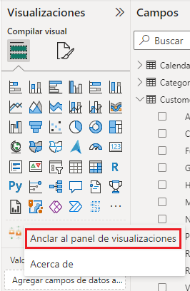 Si, por cualquier motivo, queremos que el objeto visual personalizado se muestre cada vez que ejecutemos Power BI Desktop, tendremos que <em>anclarlo</em> a nuestro panel de visualizaciones. Para ello hacemos clic con el botón secundario del ratón encima del icono que lo representa y otro clic en <em>Anclar al panel de visualizaciones</em>:
