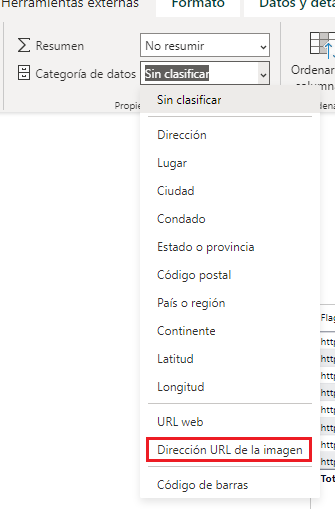 Si desplegamos este menú de opciones veremos que una de ellas es “<em>Dirección URL de la imagen</em>”. Esta es la categoría que le dice a Power BI que, cuando hagamos uso del campo <em>Flag</em>, interprete sus valores como URL’s de imágenes, y no como texto: