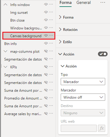 • Fondo posterior de la ventana, <em>Canvas background</em>: es posible que el usuario espere poder cerrar la ventana haciendo un clic en cualquier punto fuera de ella, acción muy natural y fácilmente implementable: basta seleccionar la forma en cuestión y aplicarle la misma acción que hemos aplicado al botón de cierre, el marcador <em>Window off</em>: