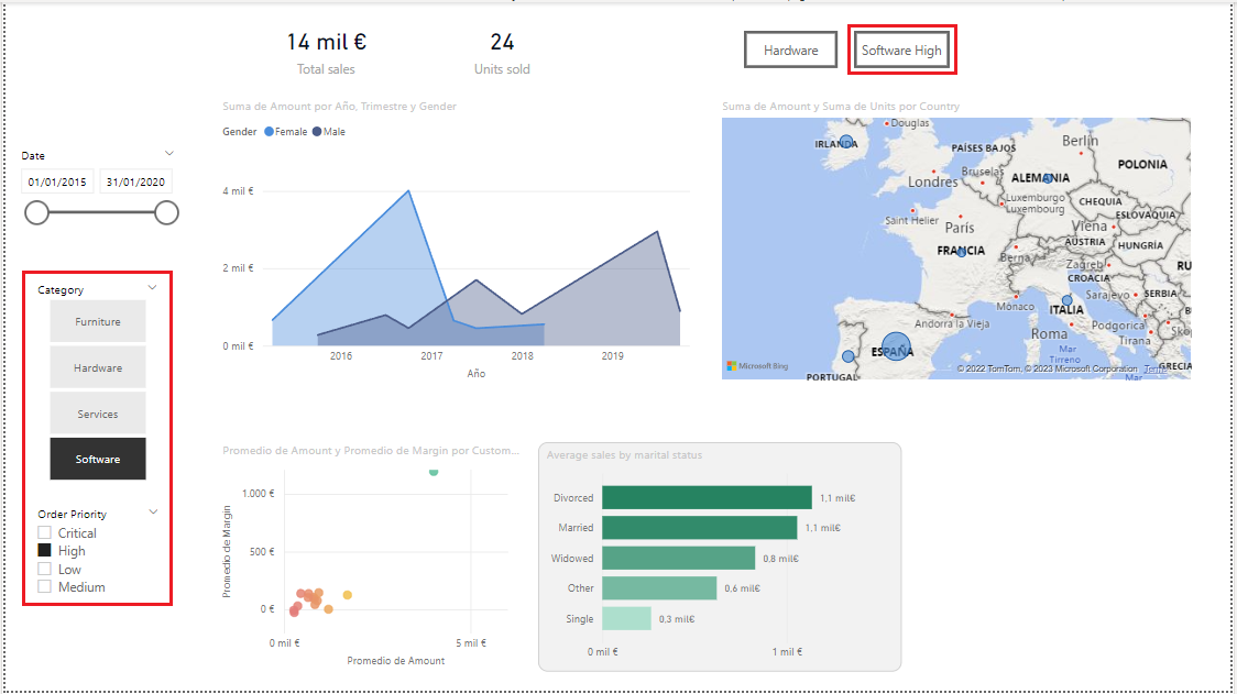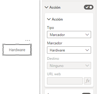 Ahora, si situamos adecuadamente los botones en nuestro informe, podremos cargar los dos marcadores en cuestión (el marcador “<em>Hardware</em>” y el marcador “<em>Software High</em>”) haciendo clic en estos botones (recordemos que, en Power BI Desktop, tendremos que hacer ese clic presionando la tecla <em>Control</em> en nuestro teclado):