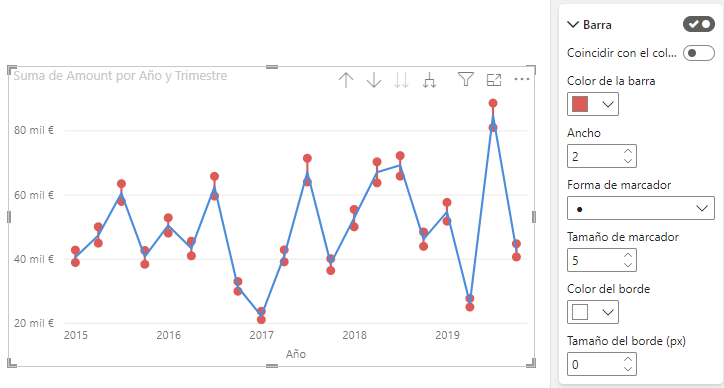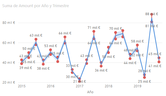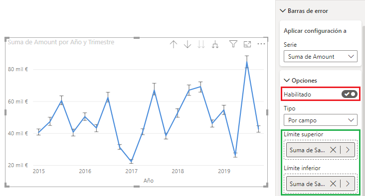 Drupal\editor\Plugin\Filter\EditorFileReference->process('Esta herramienta permite añadir a cada marca gráfica del gráfico de líneas una barra mostrando el error de cada valor con respecto a otros valores máximo y mínimo. Para simular este comportamiento, se han añadido a la tabla <em>Sales</em> dos columnas calculadas que simplemente añaden y restan un cierto porcentaje del importe de ventas. Concretamente:
