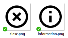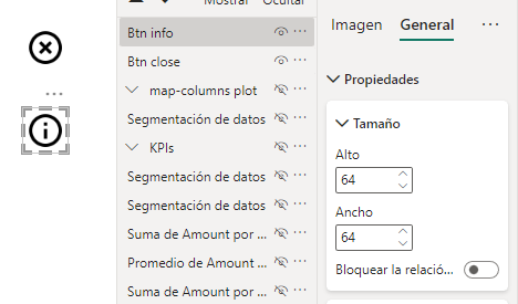 de forma que los importamos a nuestro informe (<em>Panel de herramientas > Insertar > Elementos > Imagen</em>). Les damos un tamaño de 64 x 64 píxels y los renombramos en el panel de selección (<em>Btn info</em> y <em>Btn close</em>, por ejemplo):