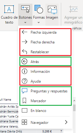 Los botones pueden incluir un icono y, como sabemos, podemos aplicarles una acción. Power BI nos ofrece algunos botones que incluyen tanto icono como una acción asociada (los botones marcados en verde en la siguiente imagen) y otros que solo incluyen icono (los marcados en rojo). El botón “<em>en blanco</em>” no incluye ni icono ni acción, y puede ser configurado como deseemos (en realidad cualquier botón puede ser reconfigurado a nuestro gusto):