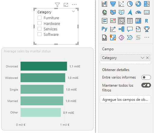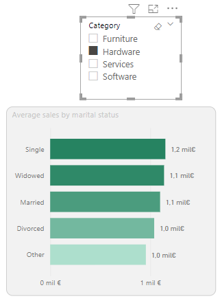 Vemos que la segmentación muestra los valores distintos de la columna <em>Category</em>, permitiéndonos hacer clic en alguno de ellos. Si hacemos clic en el valor <em>Hardware</em>, por ejemplo,, toda la página se filtrará de forma que solo se muestre información de dicha categoría de productos: