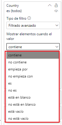 vemos que las opciones que se nos ofrecen incluyen la selección de aquellos nombres de países que incluyan un cierto texto, o comiencen por un cierto texto, etc.