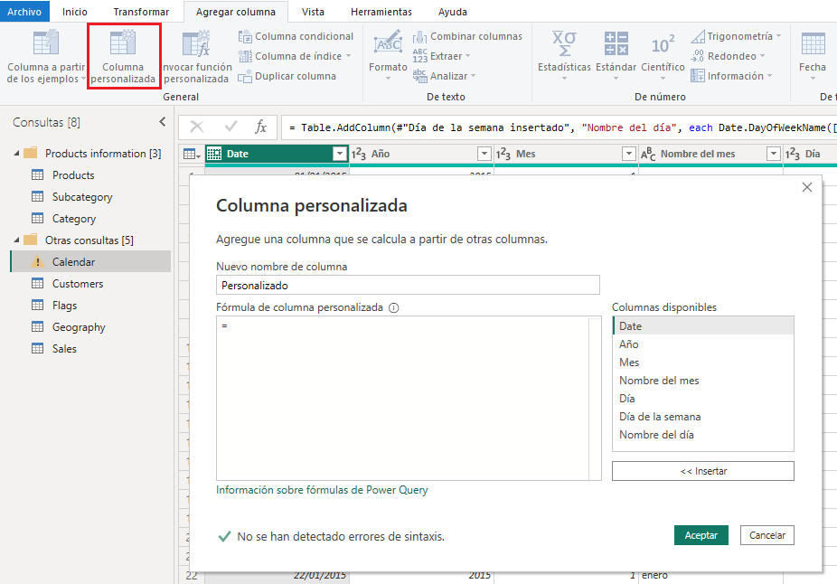 Cerremos, por lo tanto, el editor avanzado (ya sea haciendo clic en el botón <em>Listo</em> o en <em>Cancelar</em>) y seleccionemos la consulta <em>Calendar</em> en el panel izquierdo de consultas. A continuación, añadamos una nueva columna personalizada haciendo clic en <em>Agregar columna > General > Columna personalizada</em>, lo que abrirá una ventana en la que configurar nuestra nueva columna: