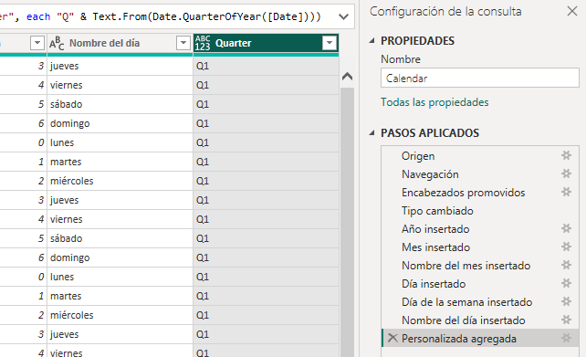 que podríamos leer diciendo “<em>queremos que en cada fila el valor de esta columna sea el resultado de concatenar el texto ‘Q’ y el número de trimestre de lo que haya en la columna [Date]</em>”.