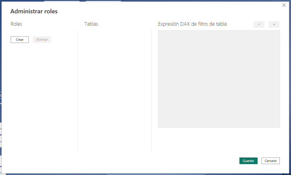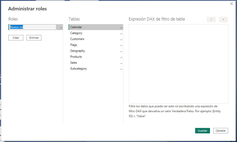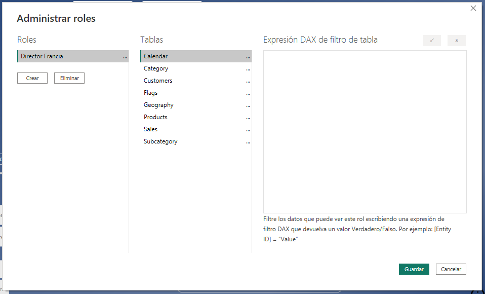 Ahora debemos definir, para cada tabla que queramos filtrar, qué condición deberán cumplir las filas para que sean visibles a este rol. Esta condición deberá escribirse en DAX en el bloque que hay bajo el texto “<em>Expresión DAX de filtro de tabla</em>” que vemos a la derecha. Esta expresión DAX será evaluada para cada una de las filas de la tabla de que se trate de forma tal que, cuando la expresión DAX devuelva el booleano <em>TRUE</em>, la fila será visible para el rol. Y cuando devuelva el booleano <em>FALSE</em>, se ocultará.