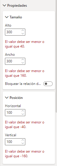 <li>Le damos la posición y el tamaño adecuado. Para ello, con el objeto visual seleccionado, vamos al panel de formato, bloque <em>General > Propiedades</em>:</li>