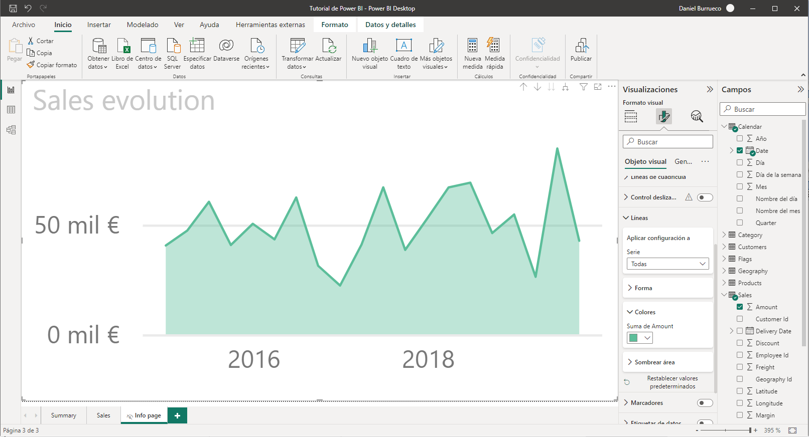 Es importante que entendamos que, ahora mismo, nuestra ventana está mostrando datos globales, sin filtrar. Es decir, en nuestro gráfico de áreas estamos viendo la evolución de la cifra total de ventas. Cuando apliquemos esta página como ventana de información a un objeto visual, sí se estarán filtrando los datos.
