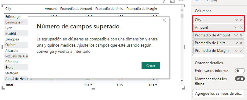 Drupal\editor\Plugin\Filter\EditorFileReference->process('Es fundamental que los campos que hayamos llevado a la tabla tengan todos menos uno una función de agregación asociada. De otra forma obtendremos un mensaje de error indicándonos que la agrupación en clústeres es compatible con una dimensión y entre una y quince medidas, lo que no sería nuestro caso. Por ejemplo, en la siguiente imagen se muestra el error en cuestión si el campo <em>Amount</em> que llevamos en primer lugar a la tabla no tuviese una función de agregación asociada: