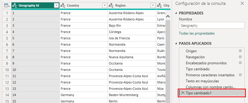 Se mostrará entonces el icono “<em>ABC</em>” indicando el nuevo tipo y el paso añadido al panel de <em>Pasos aplicados</em> (paso que eliminamos antes de continuar):