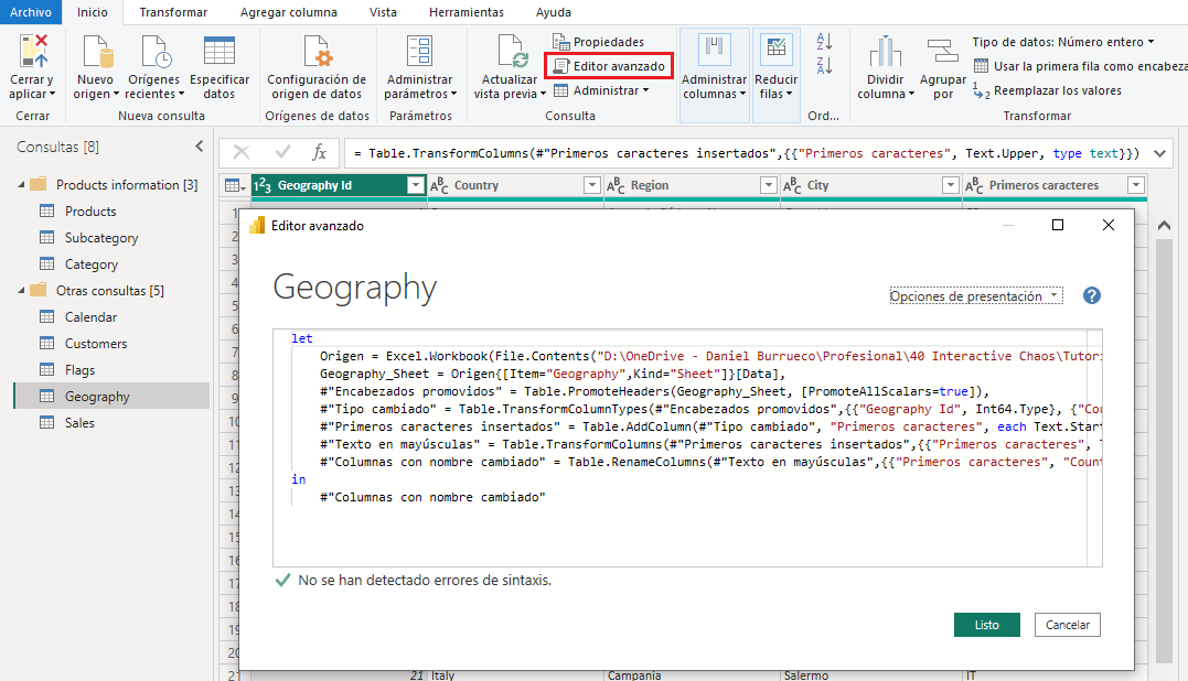 Drupal\editor\Plugin\Filter\EditorFileReference->process('Podemos ir haciendo clic en los pasos del proceso ETL uno por uno para ver el código que representa, pero, si queremos visualizar todo el código M correspondiente a una consulta, podemos abrir el <em>editor avanzado</em>. Para abrirlo necesitamos seleccionar la consulta cuyo código M queremos visualizar (por ejemplo, la consulta <em>Geography</em>) y, a continuación, ejecutar la herramienta <em>Inicio > Editor avanzado</em> (también disponible en la pestaña <em>Vista</em>). Esto abrirá el editor mostrando el código en cuestión: