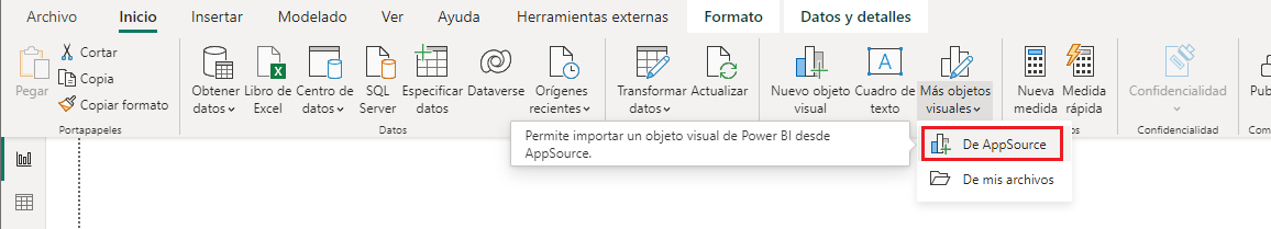 Podemos acceder al Marketplace de dos formas: desde la barra superior de herramientas, pestaña <em>Inicio > Más objetos visuales > De AppSource</em>:
