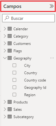 Un clic en el icono > que se muestra a la izquierda de los nombres de las tablas las despliega, mostrando sus campos: